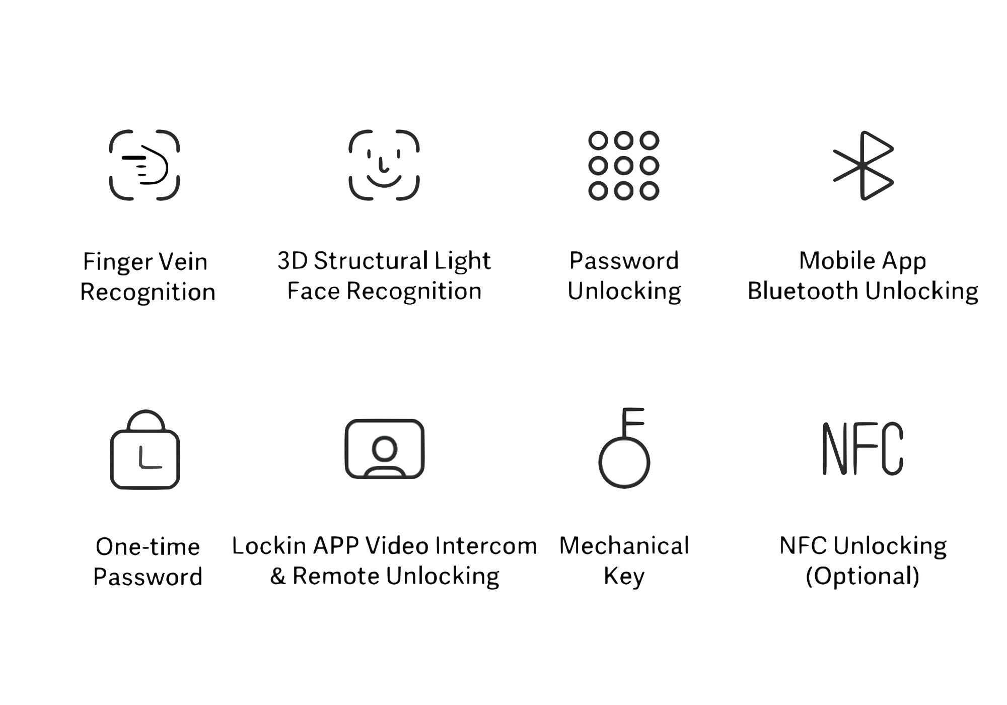 8 unlocking methods – Face, Finger Vein, App, Password, NFC, and More
